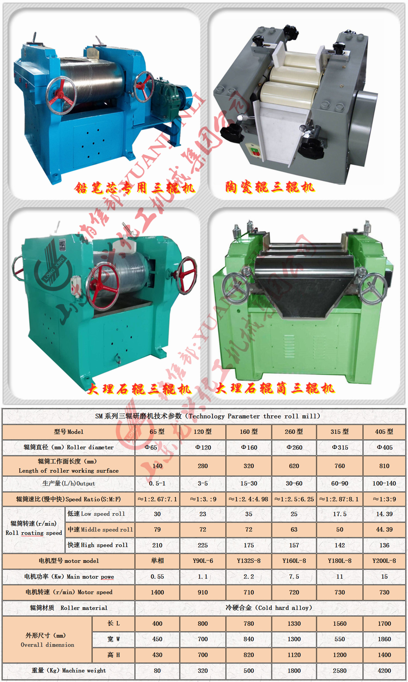 三輥研磨機是高粘度物料最有效的研磨、分散設備。三輥機主要用于各種油漆、油墨、顏料、塑料、化妝品、肥皂、陶瓷、橡膠等液體漿料及膏狀物料的研磨,特別適用于研磨分散粘度高而粒度要求細的產品及砂磨機難循環物料或不耐循環的物料。SM405型、SM315型、SM260三輥研磨機用于批量生產,SM160、SM120型、SM65三輥研磨機用于小批量或實驗室用。