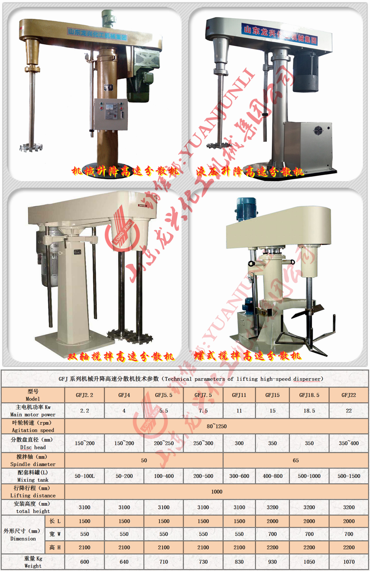 液壓/機(jī)械升降高速分散攪拌機(jī)是用于液體、固體進(jìn)行攪拌分散、溶解的高效設(shè)備,廣泛應(yīng)用涂料、油墨、顏料、膠粘劑等化工產(chǎn)品,該機(jī)由液壓系統(tǒng)、主傳動、攪拌系統(tǒng)、導(dǎo)向機(jī)構(gòu)、電控箱五部分組成,各部分結(jié)構(gòu)緊湊、合理。分散盤型式:平盤鋸齒式、三義槳式、碟式等多種形式。設(shè)備安全可靠,操作維護(hù)簡單;生產(chǎn)連續(xù)性強(qiáng),對物料可進(jìn)行快速分散和溶解,分散效果好,生產(chǎn)效率高,安裝簡便,適合各種粘度的物料的分散攪拌。