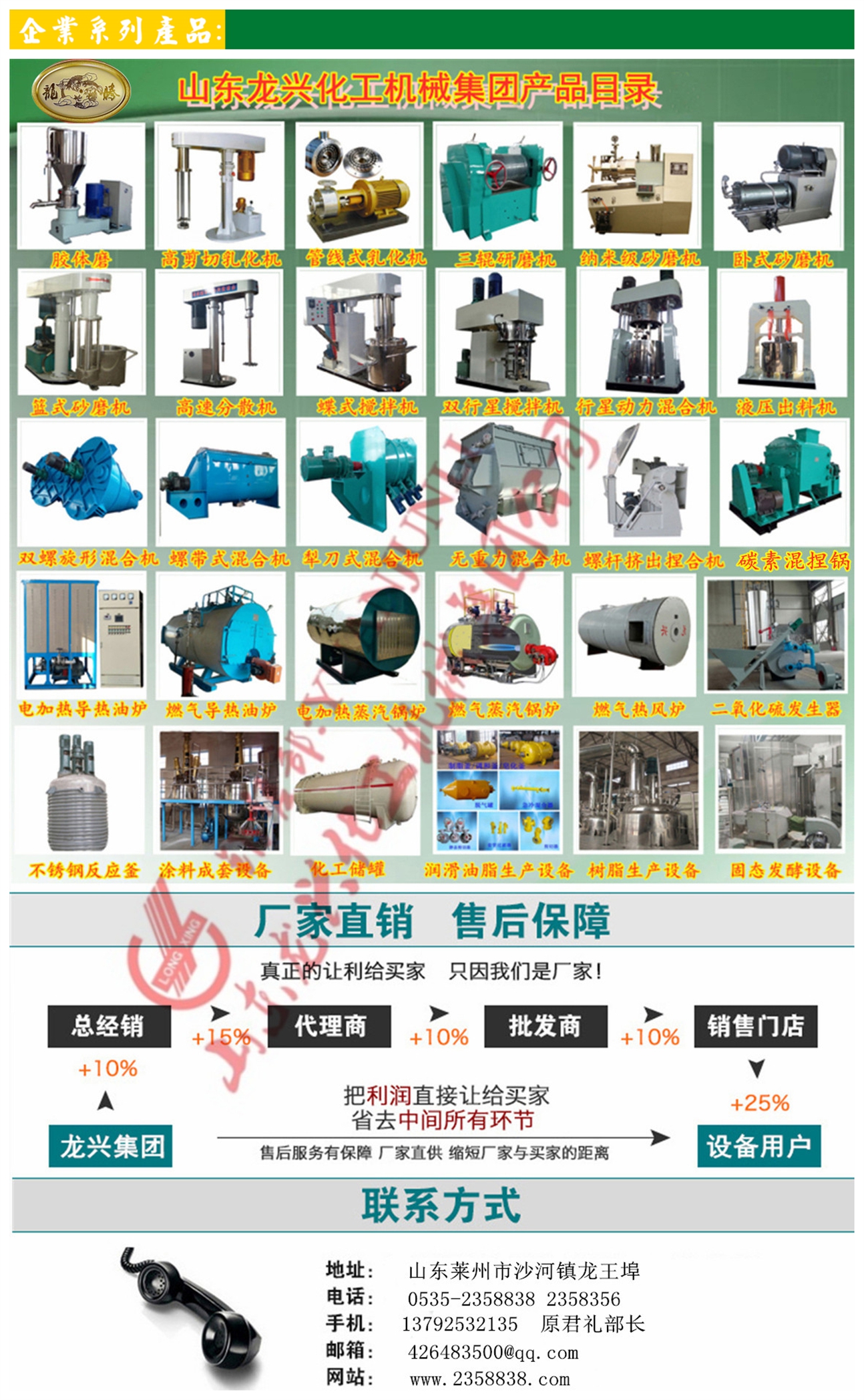 我公 司憑借在業內三十余年的技術積累和成長經歷,已經發展為集科研、開發、制造為一體的科技型集團公 司,主要業務涉及 液體研磨機、攪拌分散機,膏體混拌捏合機、雙行星動力攪拌混合機,干粉攪拌混合機,導熱油、蒸汽 鍋爐、反應釜和換熱器及一二三類壓力容器的設計與生產。同時我們承接行業用戶成套設 備及生產線的設計制造業務,龍興人愿與天下有識之士攜手共創新的輝煌。